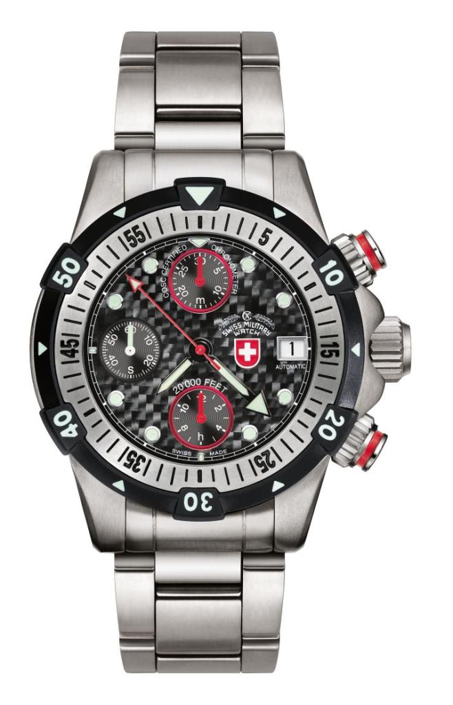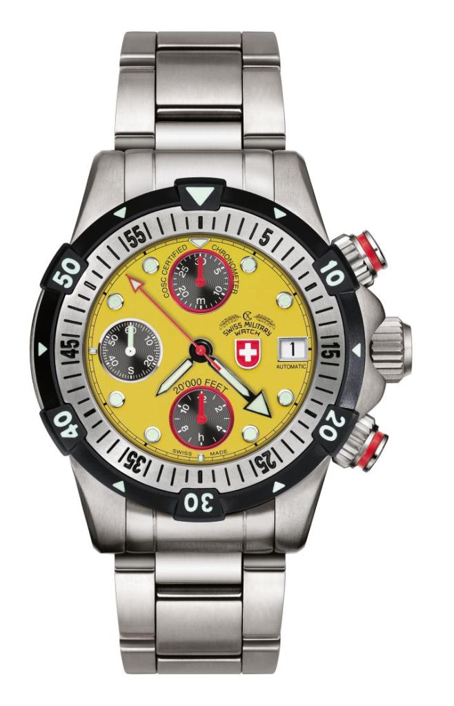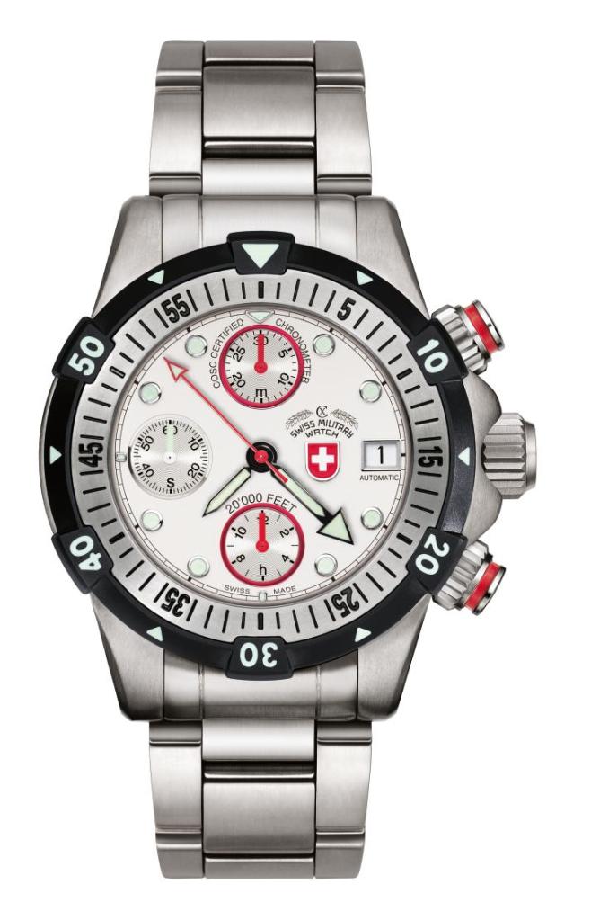 Swiss Watch Specifications: CX Swiss Military Watch automatic chronograph 20’000 FEET, ETA cal. 7750 COSC Swiss Made automatic mvt., silver dial, titanium case/bracelet (length 200mm, width 24mm, safety butterfly buckle with diving extension), unidirectional two-tone bezel with full 60′ graduation and pre-select luminous marker as per ISO 6425, anti-magnetic ISO 764, screw-down crown/pushers, anti-reflective sapphire crystal, helium relief valve, additional rubber strap. Case: diameter 46.0 mm, thickness 28.5mm, 600atm water resistant ISO 6425. Weight: 265gr. HS-Code: 9102.2100.125. Guinness Book of World Record holder for automatic diving watches