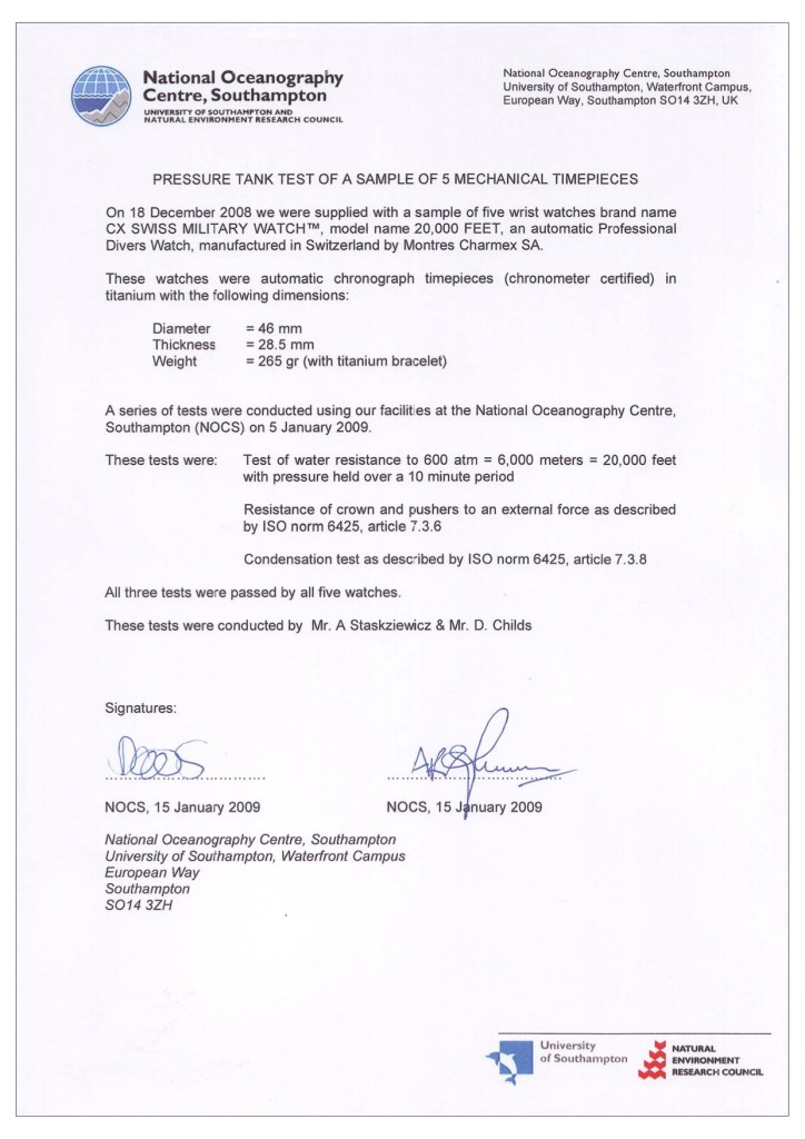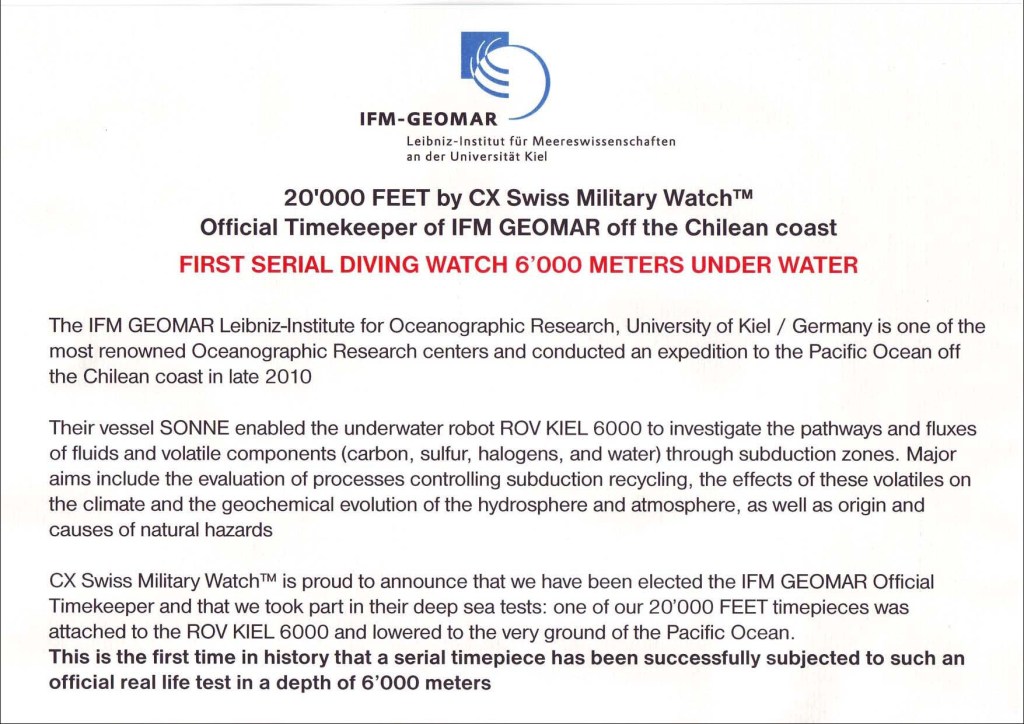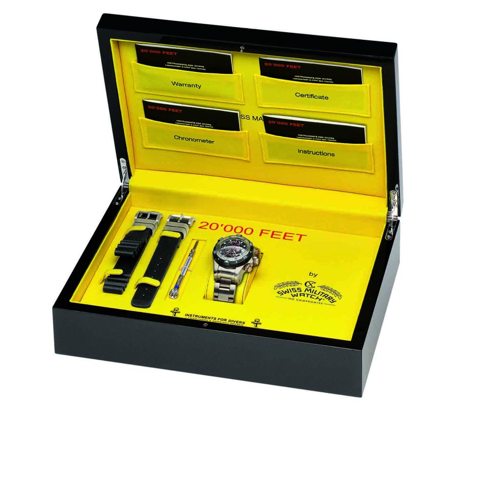 The CX Swiss Military Watch ™ 20.000 FEET reaches into a new, hitherto unthinkable dimension of water resistance and is the world’s first and only serial mechanical diving watch water resistant to an incredible 20’000 feet or 6’000 meters – certified by the GUINNESS BOOK OF WORLD RECORDS as the world record holder since 2009! But not enough – in order to comply with ISO norm 6425 we constructed the watch to be water resistant to 7’500 meters, resulting in the required 25% safety margin and annihilating Rolex’ world record of 2008 by an impressive 50%. A timepiece like no other, a technological breakthrough setting a new benchmark. The domed anti-reflective sapphire crystal is a solid 10mm thick and can withstand a pressure of 750kg – per square centimeter. The 20’000 FEET is limited to 1’000 pieces only and comes in a heavy-duty wooden gift box including a rubber strap. A Tool for Professional Divers indeed!