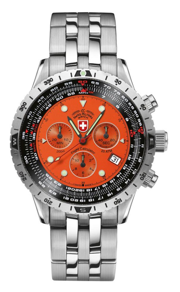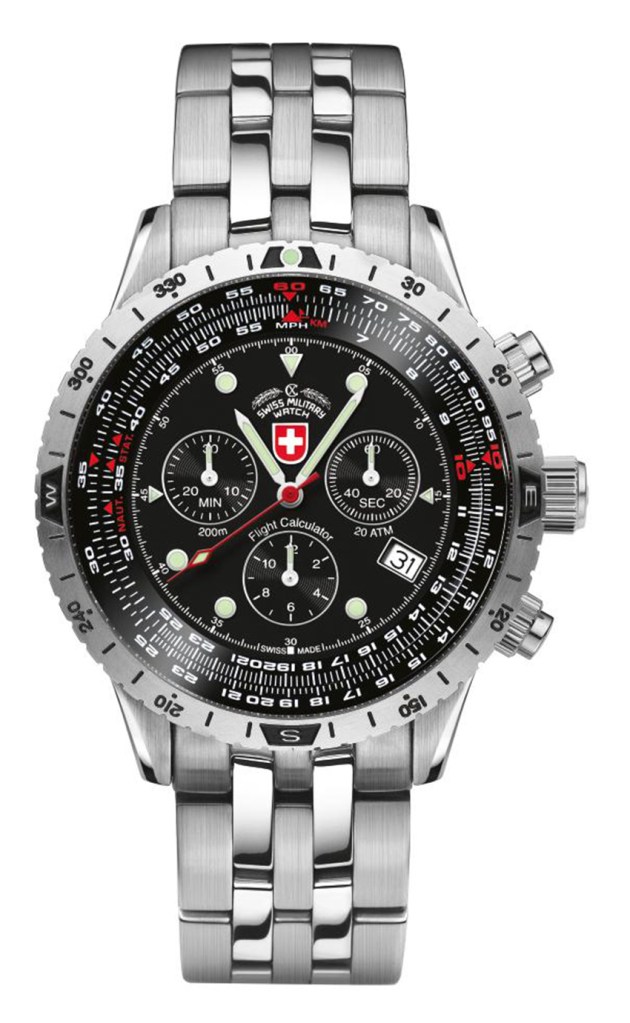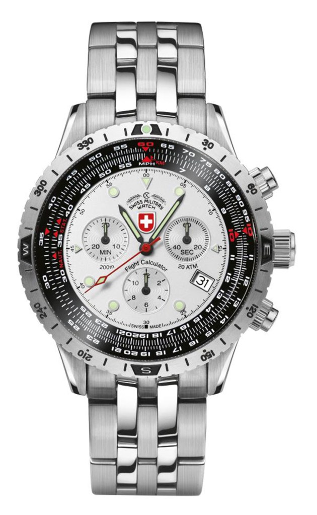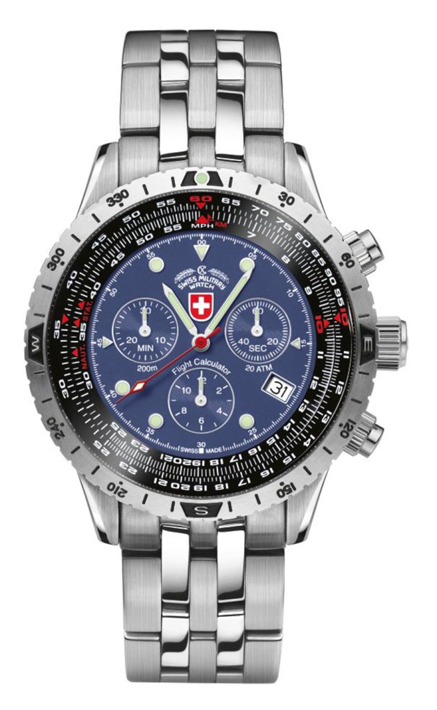 Specifications: CX Swiss Military Watch chronograph AIRFORCE 1, Ronda cal. 5030 Swiss Made quartz chronograph mvt., stainless steel case & bracelet (length 160mm, width 18mm, safety butterfly buckle), bi-directional slide-rule bezel, screw-down crown/pushers, sapphire crystal. Case: diameter 41.5mm, thickness 13.5mm, 20atm water resistant. Weight: 160gr. HS-Code: 9102.1100.125