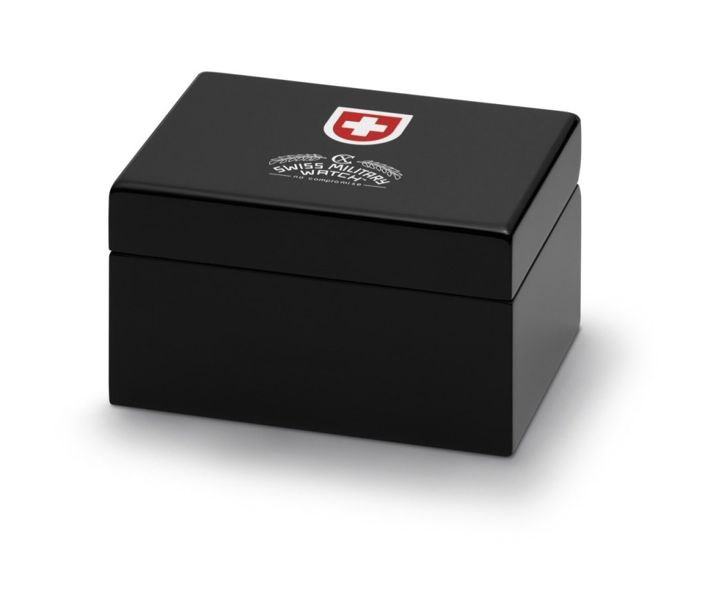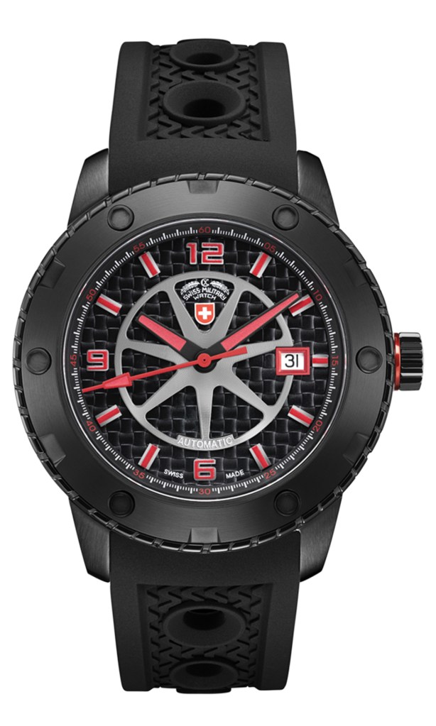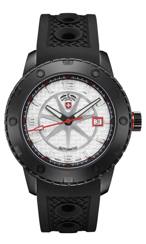 Specifications: Swiss Military Automatic Watch, RALLYE AUTO , ETA cal. 2824 Swiss Made Automatic mvt., 25 jewels, sandblasted stainless steel case, screw-down crown, sapphire crystal, silicone strap (length 225mm, width 22mm, thickness 4mm; pin buckle). Case: diameter 44mm, thickness 12mm, 20atm water resistant. Weight: 122gr. HS Code: 9102.2100.116