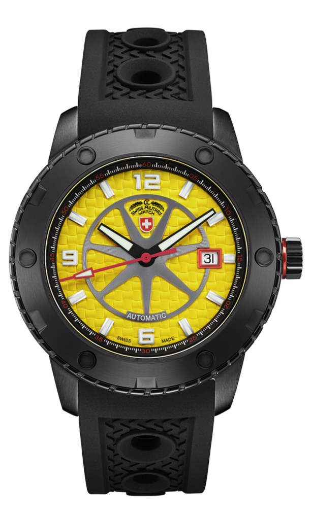 The RALLYE AUTO sets a new standard in its class of motorsports watches: the design of the complete case was inspired by the heavy duty wheels used in rallye motorsports and the ETA cal. 2824 Swiss Made automatic movement is as trustworthy as any V8 engine. The sapphire crystal protects an intricately designed dial that resembles the spokes of a wheel. The RALLYE AUTO is water resistant to 200 meters and is available in five dial colours – silver, black, blue, Monza red and Dakar yellow (all with professional grade luminous Superluminova™ indices) and either a sandblasted case or a highly scratch resistant black DLC-plated case