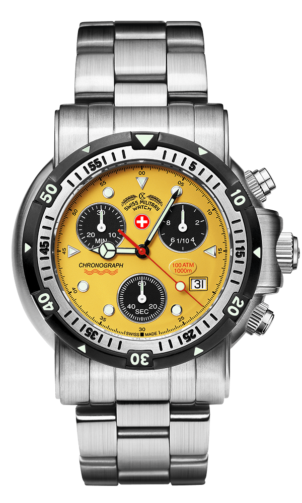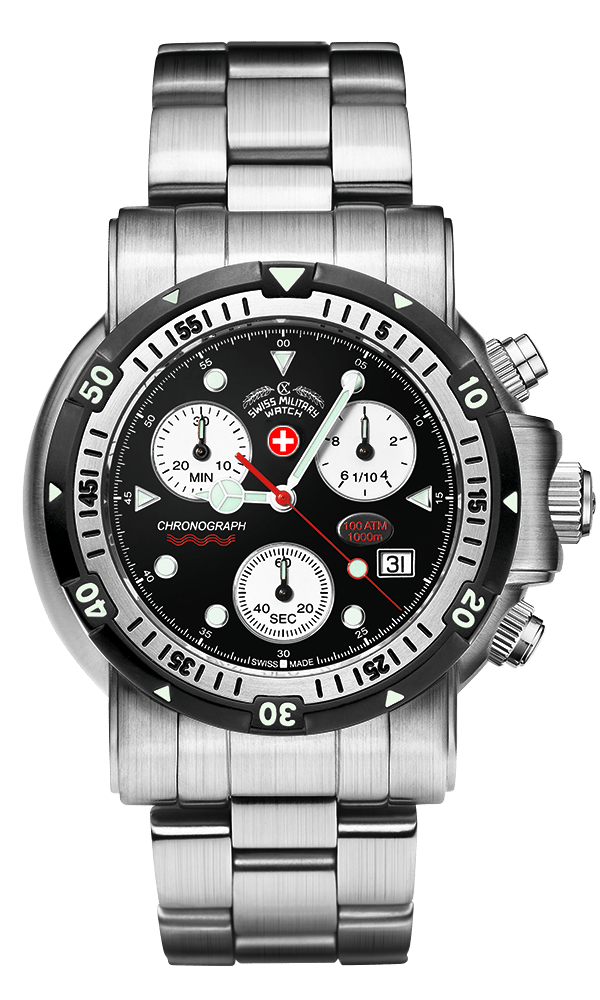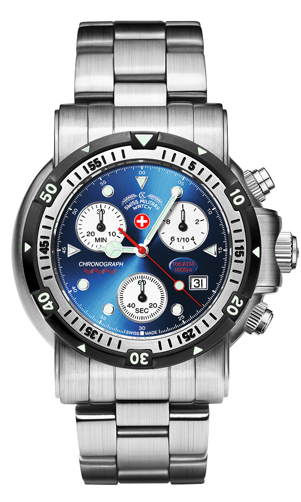 Specifications: CX Swiss Military Watch chronograph SEEWOLF I, ETA cal. G10.712 Swiss Made quartz mvt., stainless steel case & bracelet (length 190mm, width 20mm, safety butterfly buckle with diving extension), unidirectional two-tone diving bezel with full 60′ graduation and pre-select luminous marker as per ISO 6425, screw-down crown & pushers, sapphire crystal. Case: diameter 44mm, thickness 17mm, 100atm water resistant. Weight: 250gr. HS-Code: 9102.1100.125