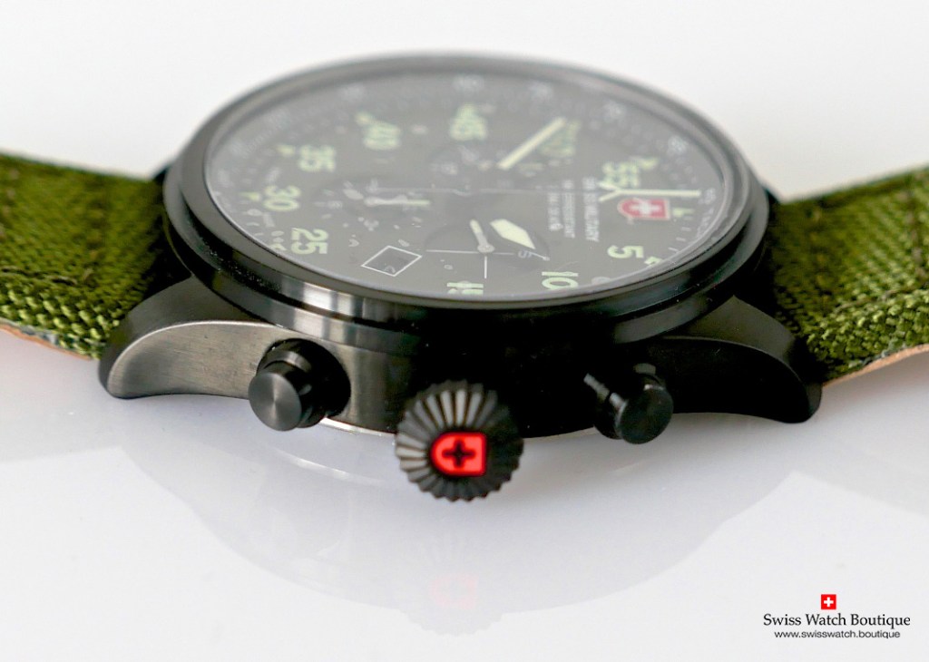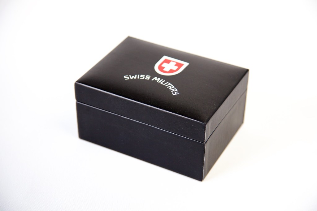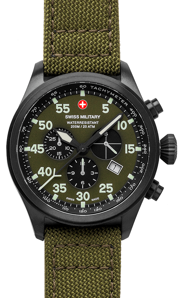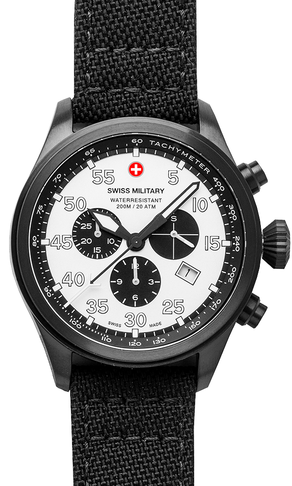 Specifications: Swiss Military chronograph HAWK NERO, Ronda cal. 5030 Swiss Made quartz chronograph mvt., 13 jewels, silver dial, black PVD plated stainless steel case & bracelet (length 190mm, width 20mm, safety butterfly buckle), screw-down crown, sapphire crystal. Case: diameter 44mm, thickness 12mm, 20atm water resistant. Weight: 204 gr. HS-Code: 9102.1100.125