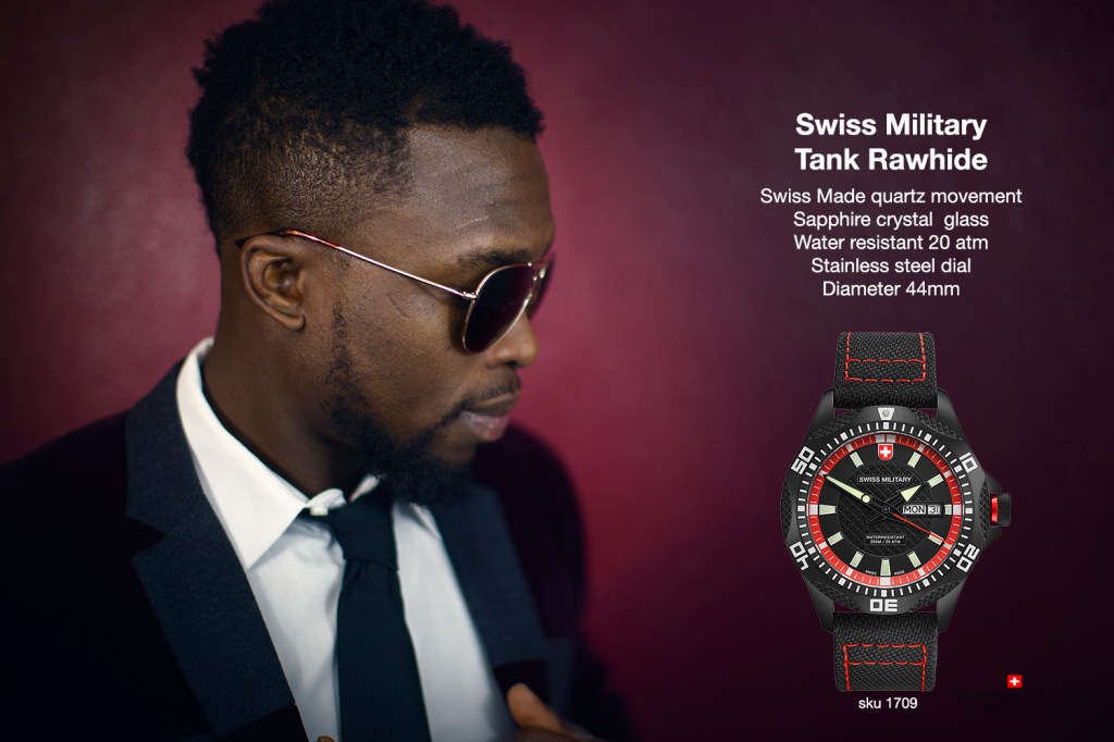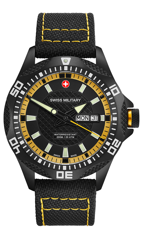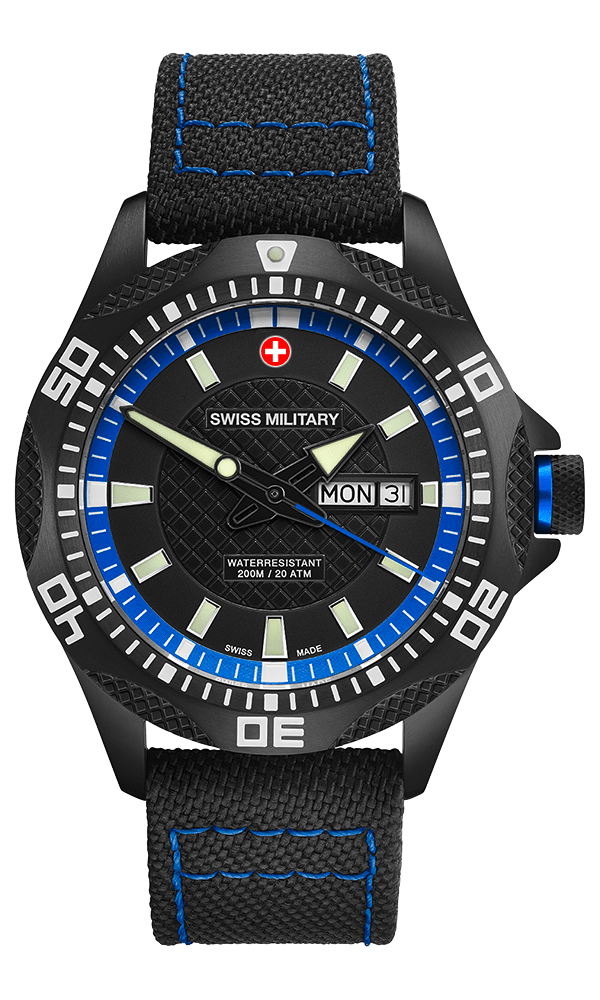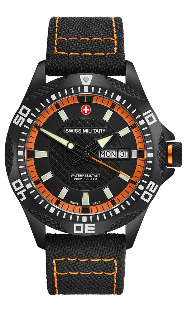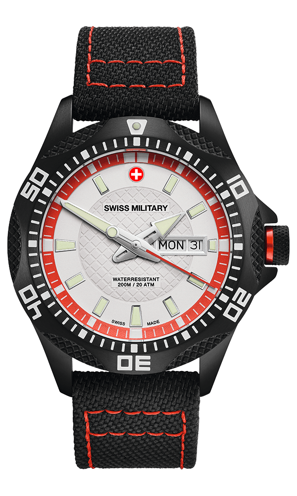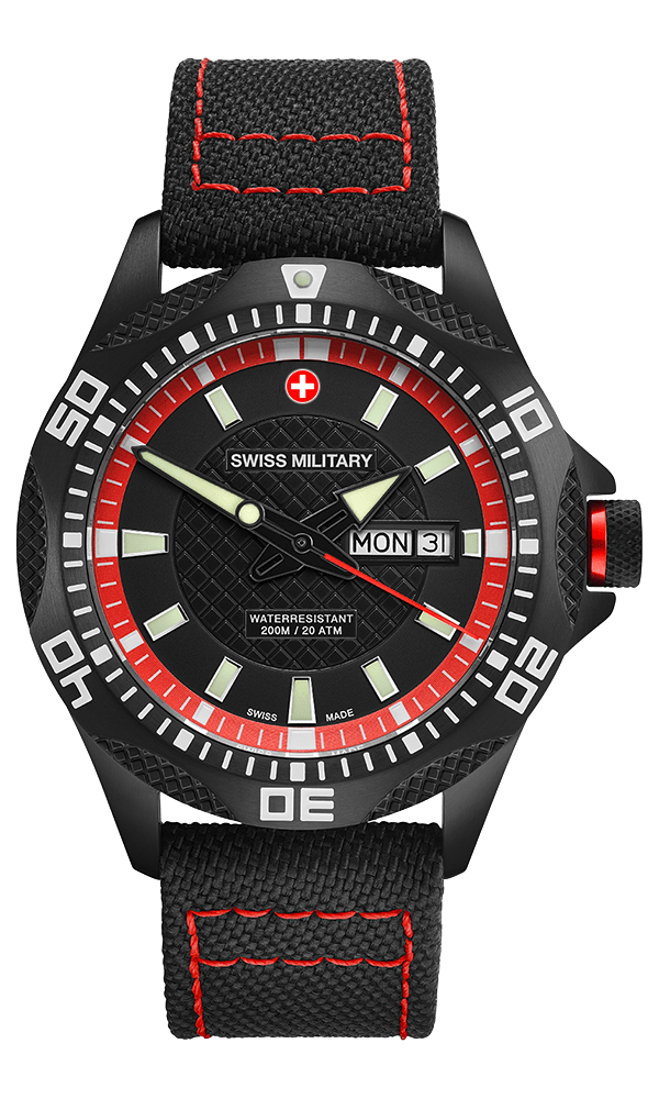 Specifications: Swiss Military day/date PANZER NERO RAWHIDE, Ronda cal. 517 Swiss Made mvt., silver/red dial, black PVD plated stainless steel case, screw-down crown, sapphire crystal, black genuine canvas strap (length 190mm, width 22mm; pin buckle). Case: diameter 44mm, thickness 12mm, 20atm water resistant. Weight: 102gr. HS-Code: 9102.1100.116