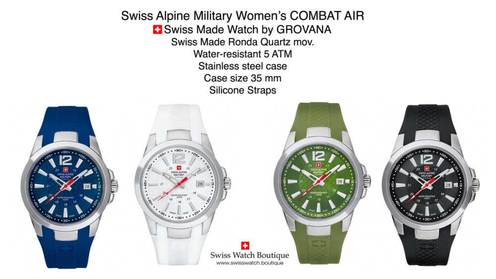 Swiss Alpine Military COMBAT AIR for Women, is one of the finest sellers of the brand. A design well appreciated especially by the youth, because of its classic yet sporty look. A Swiss Made Watch by Grovana Watch Co. Swiss Watch makers since 1924 and a company registered with the Swiss Watch Federation, this is one of the finest and affordable Swiss Watch indeed.